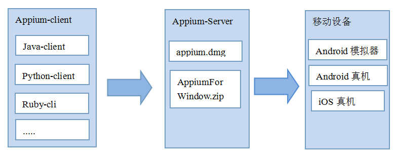 如图所示,appium 主要分为三个点:client 端,server 端,及测试移动设备