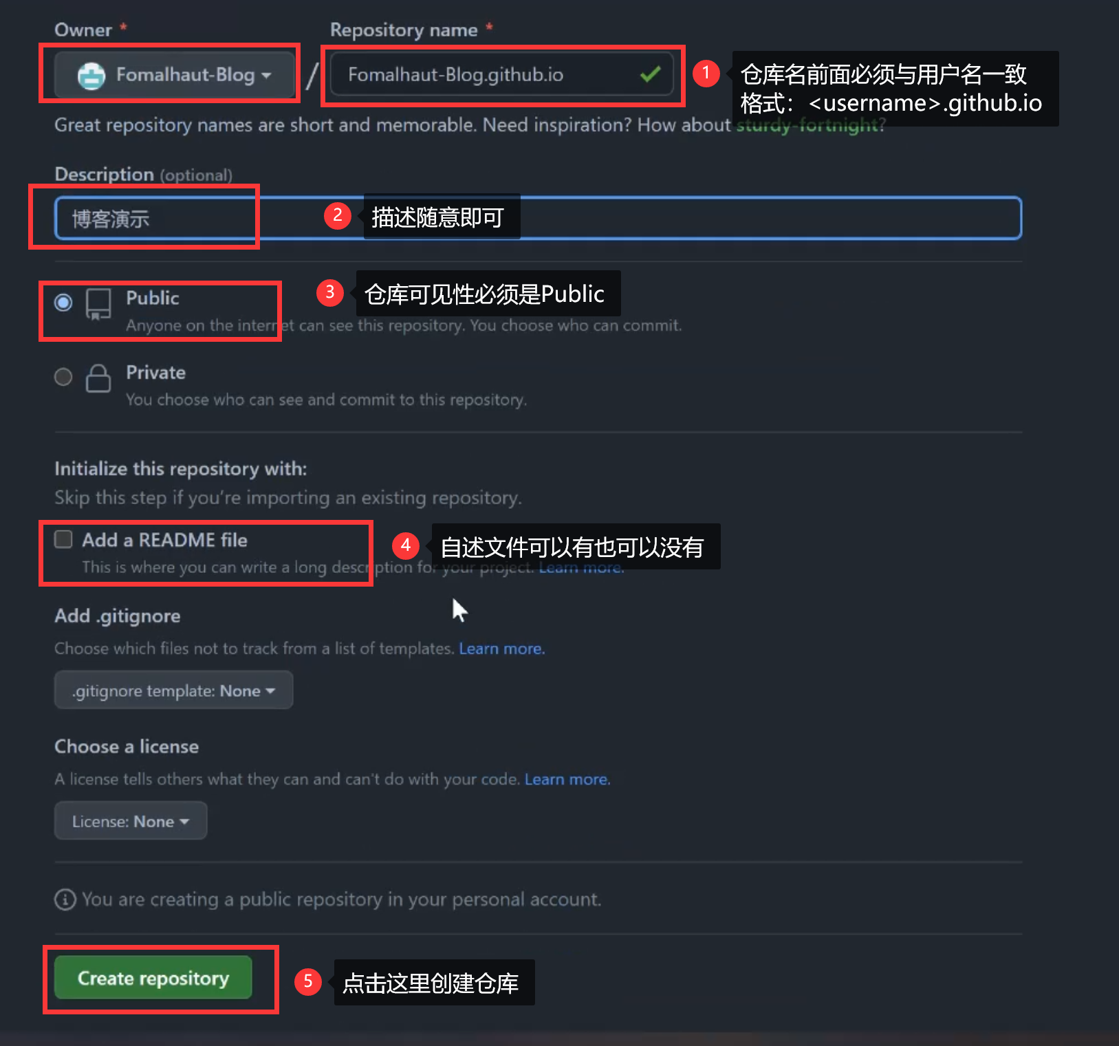 <用户名>.github.io(注意:前缀必须为用户名,不要等后面404了再来为什么!!!) - Description:为描述仓库(选填)