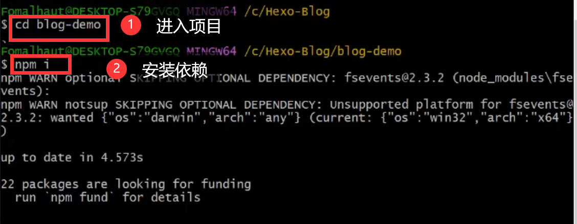 |1 2|cd blog-demo //进入blog-demo文件夹 npm i|