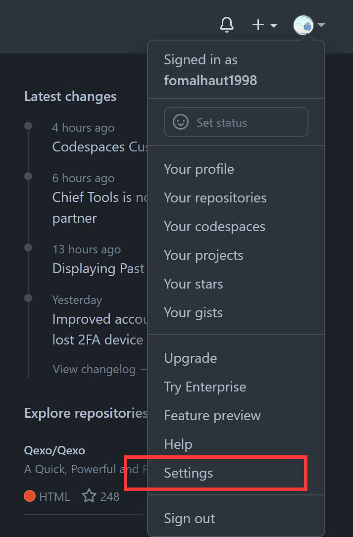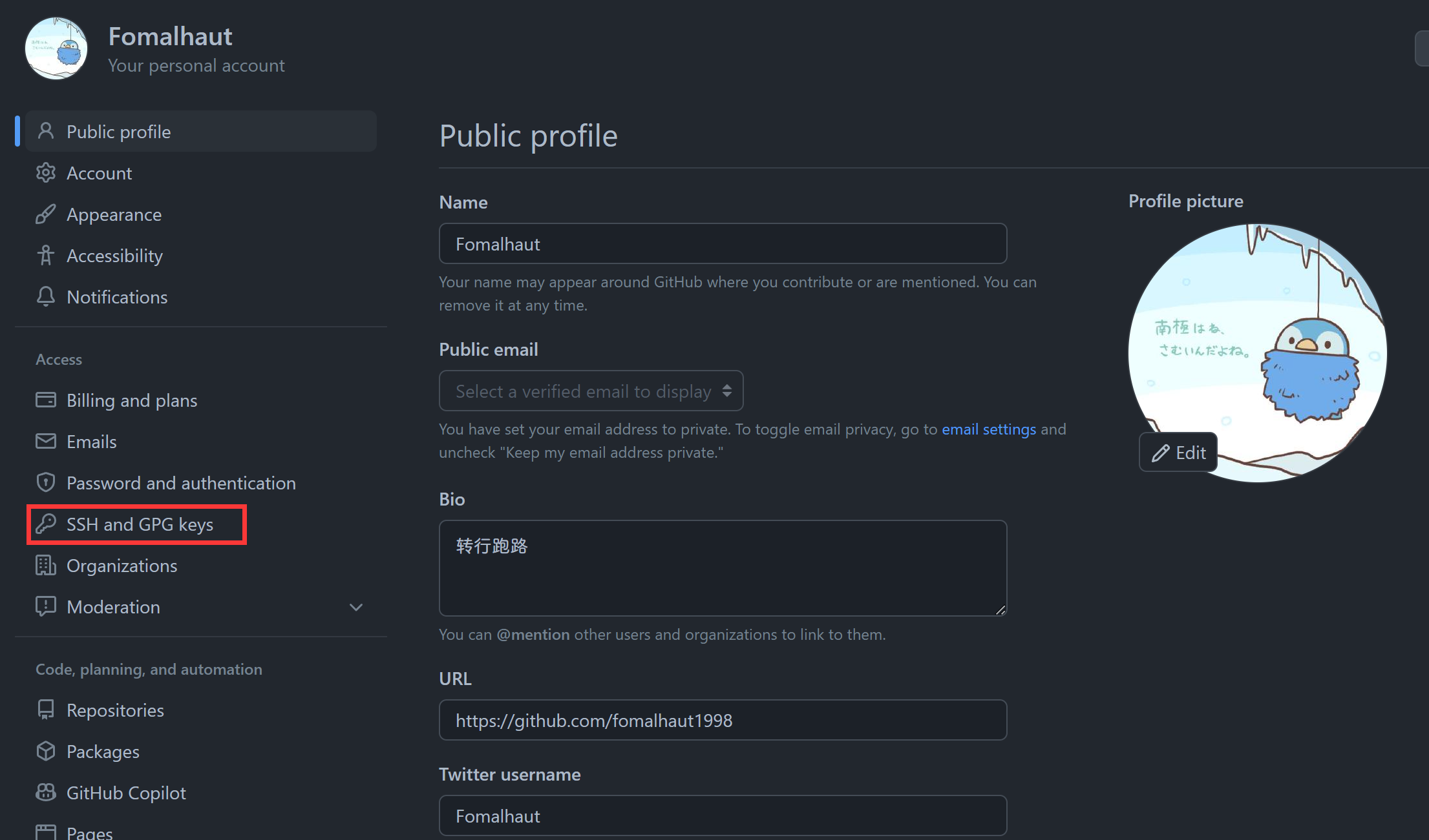 settings,进入设置页后选择SSH and GPG keys,名字随便起,公钥填到Key那一栏。