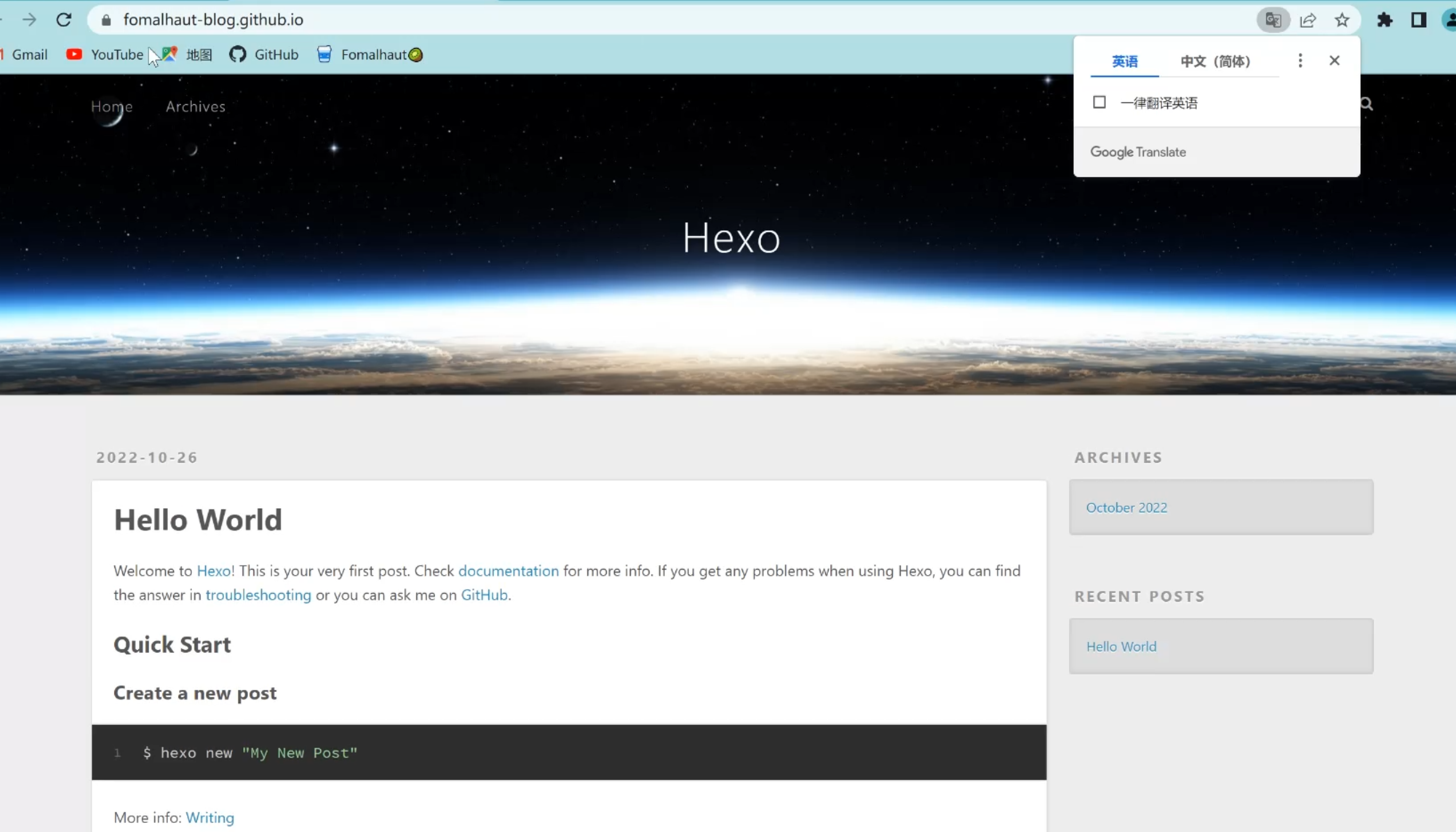 稍等两分钟,打开浏览器访问:https://Fomalhaut-Blog.github.io ,这时候我们就可以看到博客内容了。