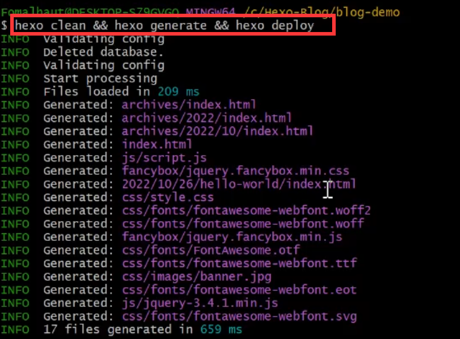 |1 2|hexo clean && hexo generate && hexo deploy // Git BASH终端 hexo clean; hexo generate; hexo deploy // VSCODE终端|-
