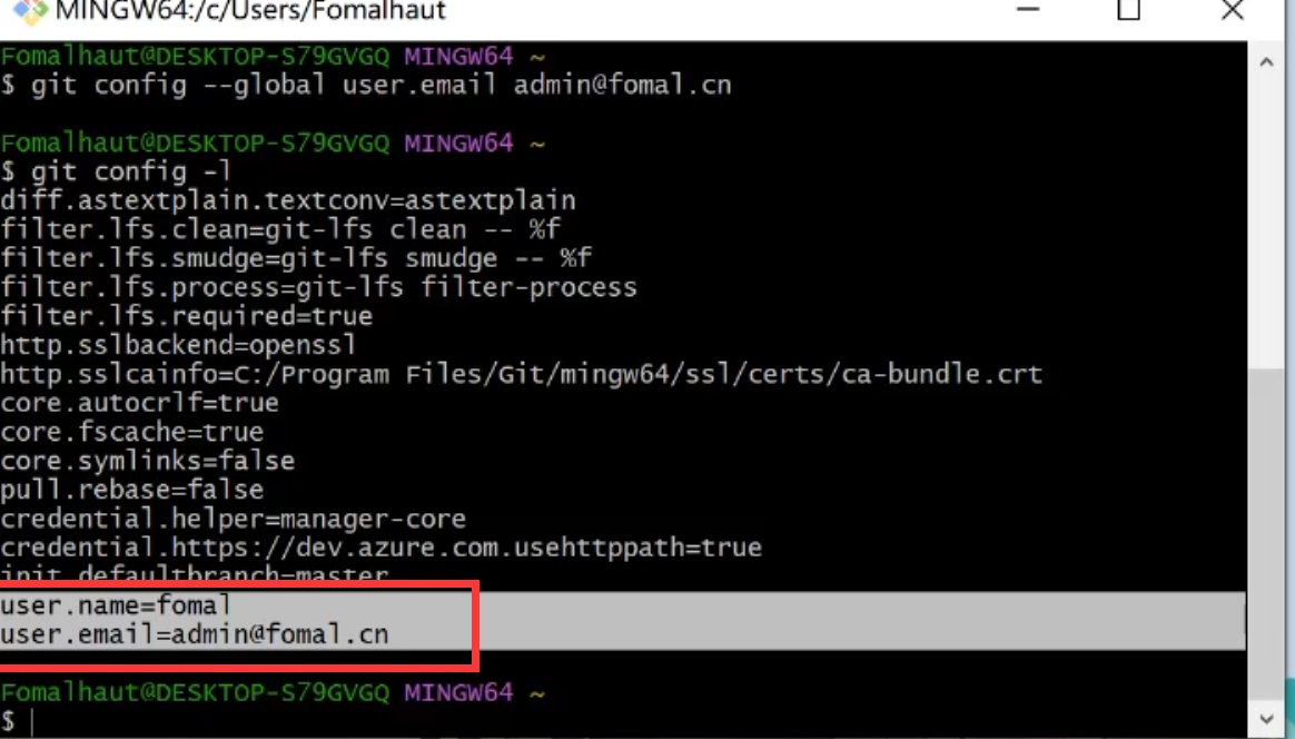 git config -l检查是否配置成功,至此git安装及配置全部完成。