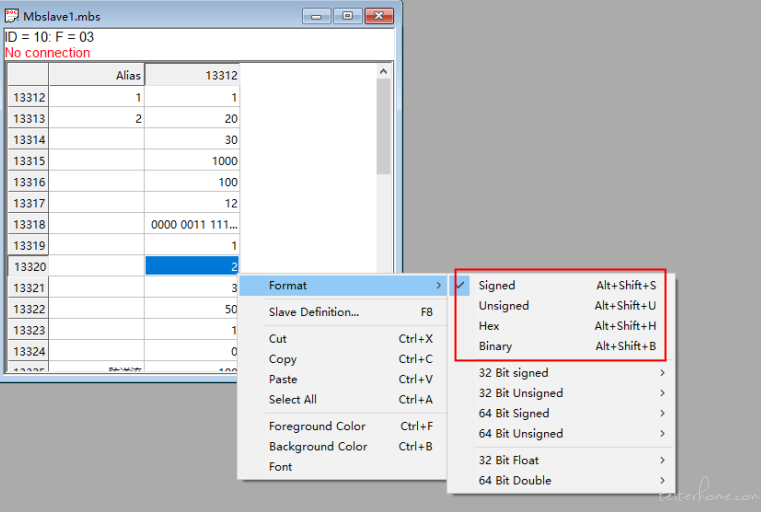 4、寄存器的写入参数值,若遇到写入的值为 Bit 类型时,选择需要参数值,右键选择 "Format" 改成 Binary