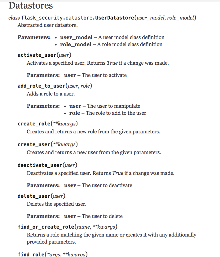 上面是我初始化数据库的代码。 为了能使用 Flask-Security。我们使用 SQLAlchemyUserDatastore 来封装 db, 使用 Security 封装我们的 web app。 接下来就可以看到我们使用很方便的方式创建 user 和 role。 并且使用 add_role_to_user 的方式为一个用户添加角色。Flask-Security 为我们提供了很多有用的方法。请看下面的截图: