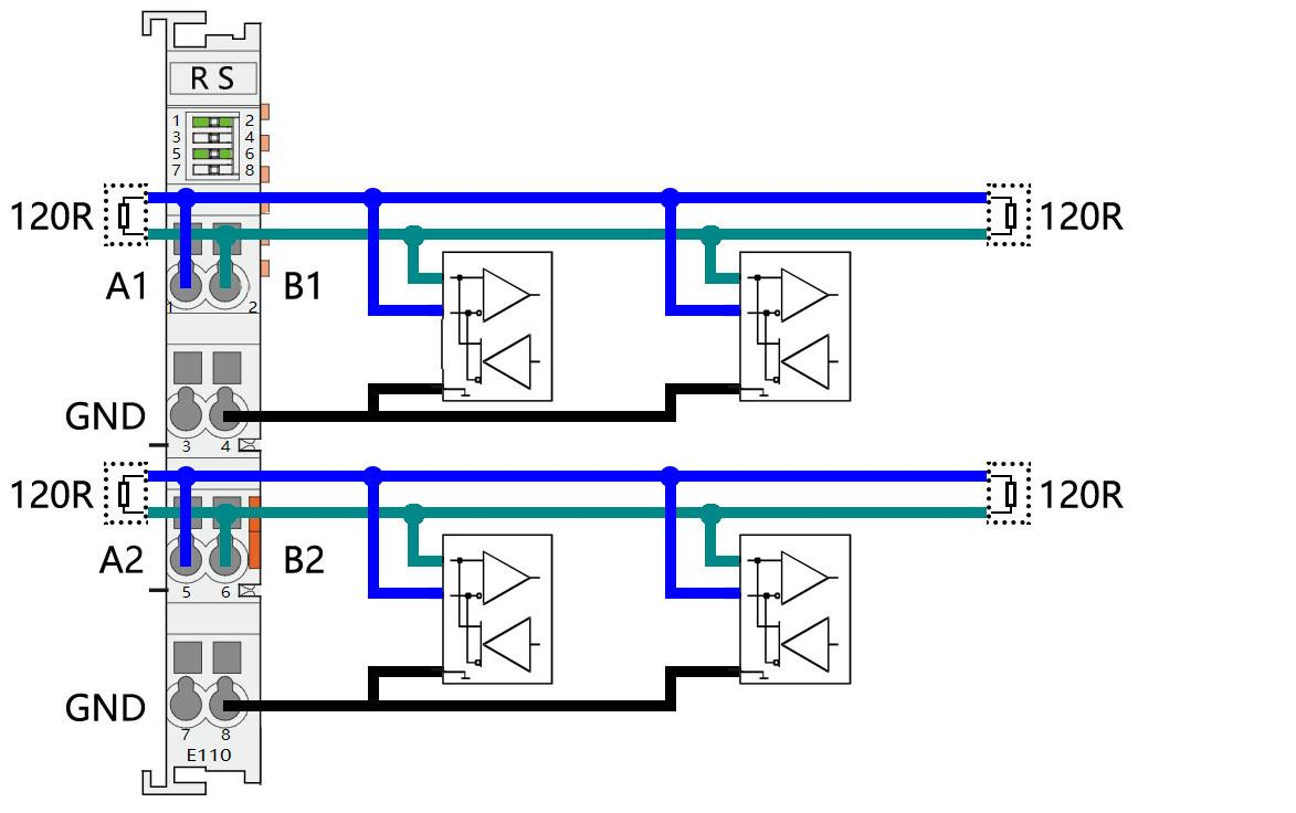 在 RS485 模式下(总线连接),对于使用较长的电缆或更高的传输速率的应用中应使用双绞线,电缆的两端应连接终端电阻,终端电阻值为 100Ω~120Ω。
