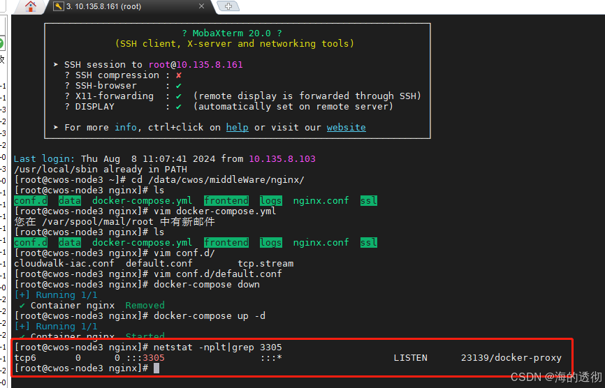 配置完成后,由于我们的nginx是部署在容器内部的,所以我们需要把容器内部的端口3305映射到容器外部,修改nginx服务的docker-compose.xml文件,如下图所示:
