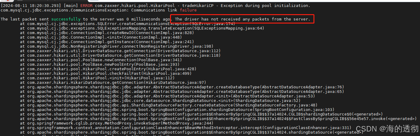 然后修改我们很多java服务的mysql配置端口,看看能不能正常启动,结果失败了,服务日志提示,无法和mysql服务建立长久的socket连接(JDBC(Java Database Connectivity)是一种执行SQL语句的Java API,用于连接和操作数据库。当使用JDBC连接MySQL数据库时,实际上是通过Socket连接实现的),jdbc连接超时,无法收到mysql服务的包,如下图所示: