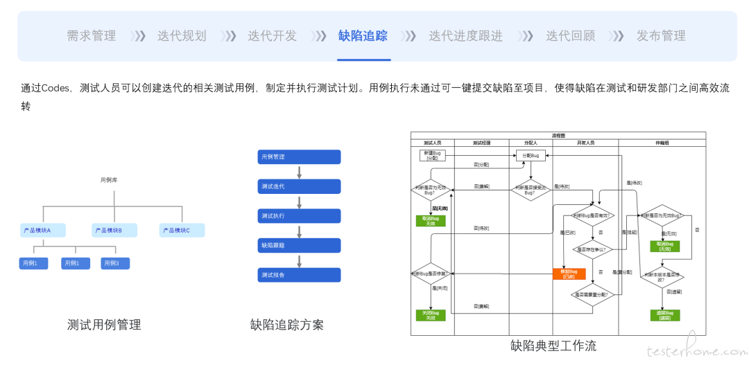 Codes 采用创新的流程驱动,能够 "因地制宜", 告别一刀切,可按需实时调整测试流程,以反映不同管控目的;不同流程对应不同的 bug 状态,更能反映项目实况,并根据流程推动 bug 状态的演化。