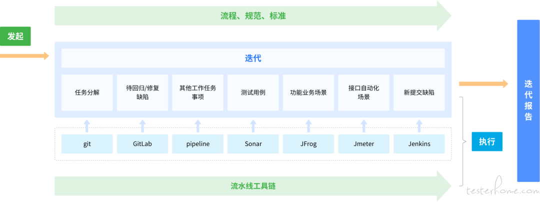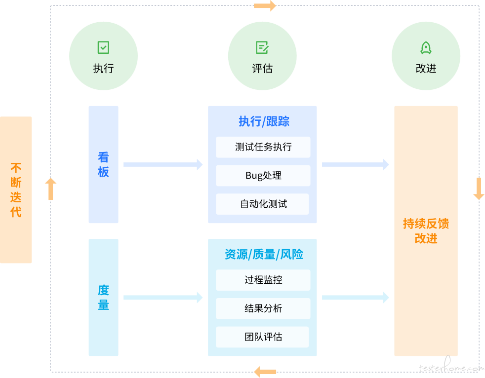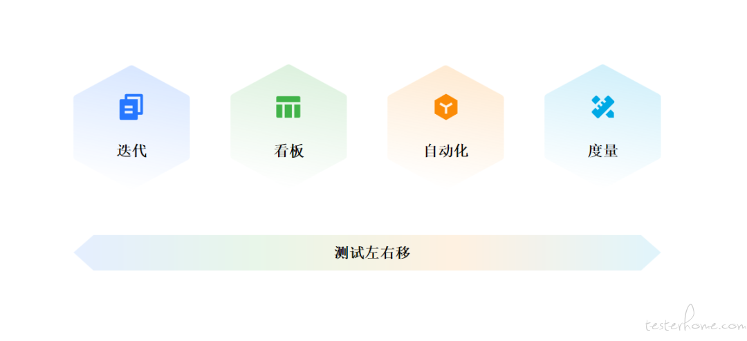 迭代作为测试的实施组织形式;看板让各阶段研发活动公开透明,将测试工作透明化,;自动化可以提高测试效率;度量让测试成果可量化;测试左右移使测试紧跟开发的节奏,且尽早开展测试,右移一可让测试独立维护测试环境,二可确保生产环境任何风吹草动都可被测试感知。