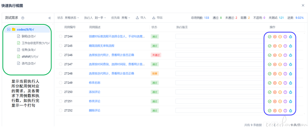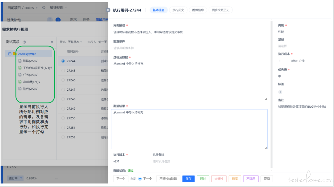 常规执行会一个一个弹窗显示用例明细,左则显示当前执行人所分配用例对应的需求,及各需求下用例数和执行数,如执行完显示一个打勾。如下图所示: