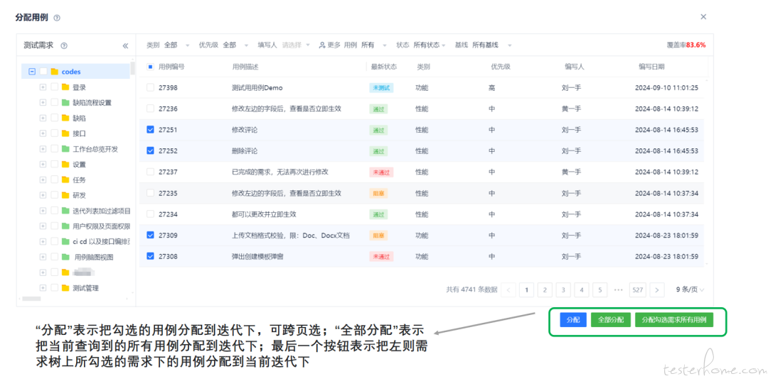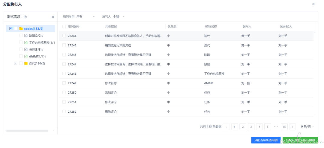 上图中 "分配" 表示把勾选的用例分配到迭代下,可跨页选;"全部分配" 表示把当前查询到的所有用例分配到迭代下;最后一个按钮表示把左则需求树上所勾选的需求下的用例分配到当前迭代下。