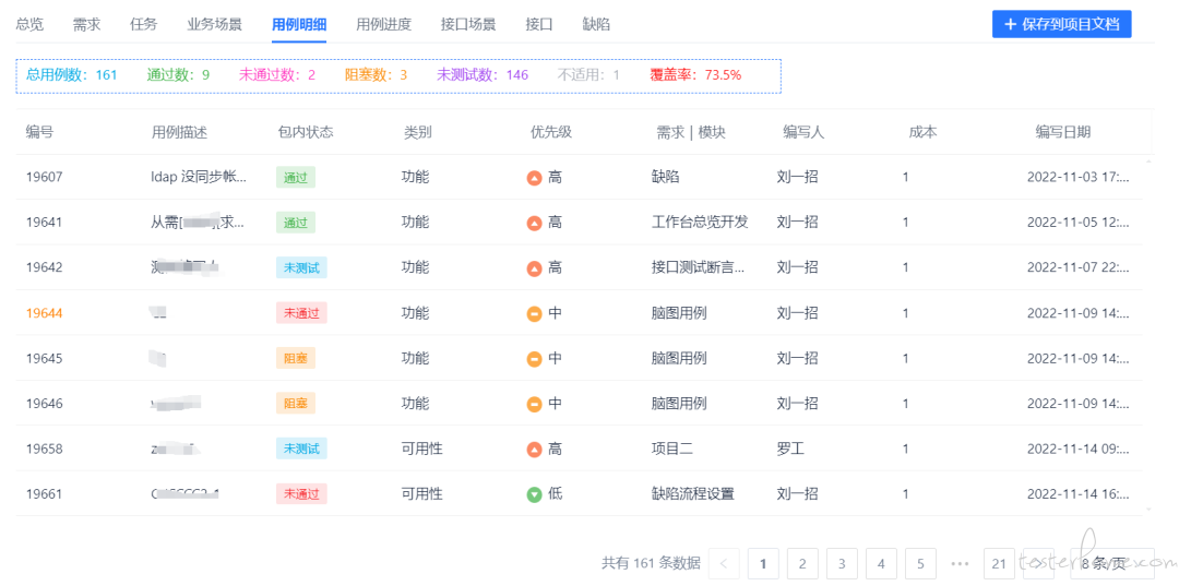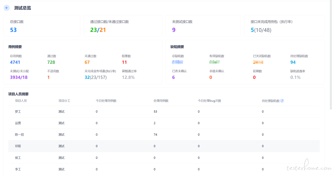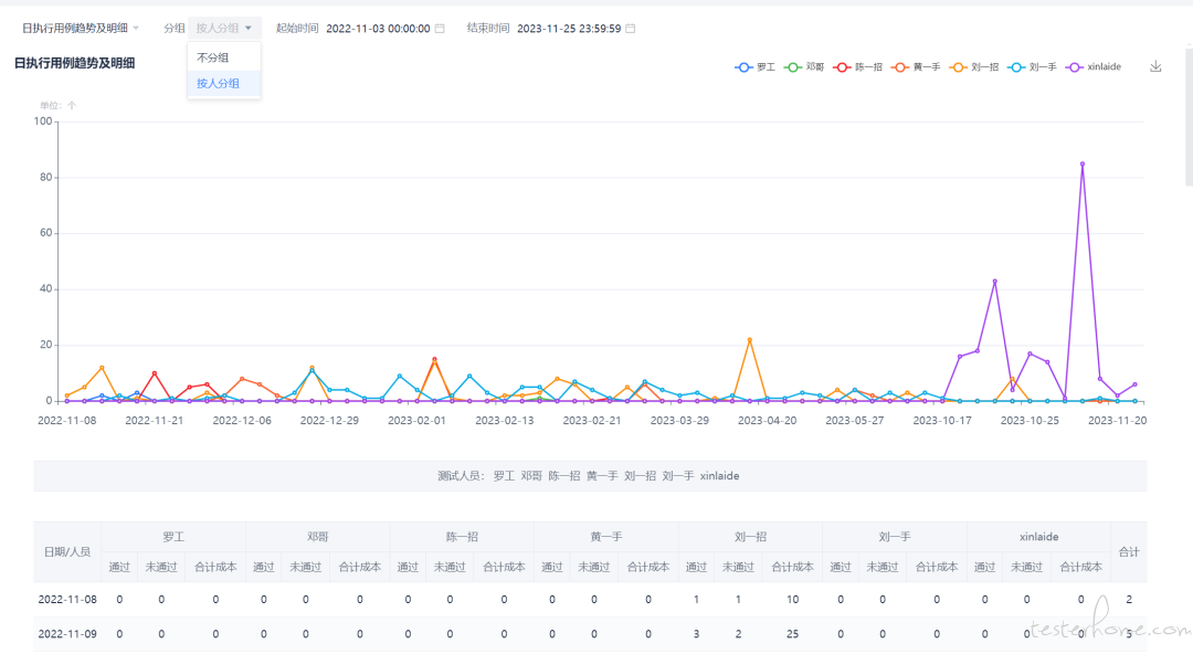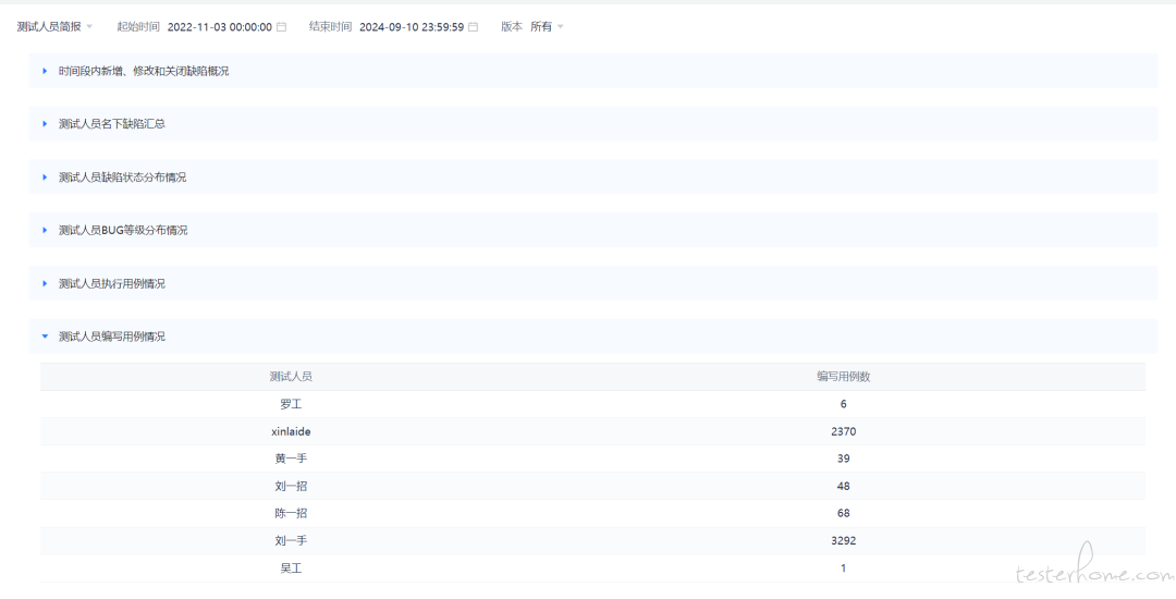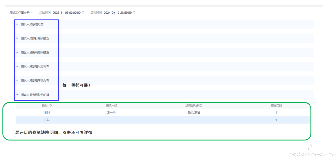 对对比各测试人员工作情况,且每一项可展开查看明细,如下图所示:
