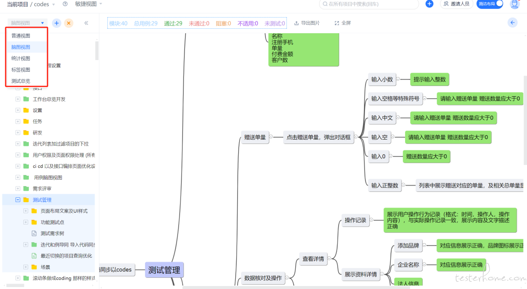 还可以在执行人、状态、类别、优先级、需求和脑图视图间切换。下图为脑视图。