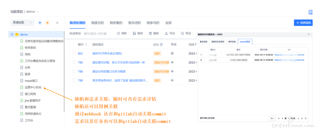 缺陷和需求关联,随时可查看需求详情;缺陷还可和用例关联;通过 webhook 缺陷还可和 gitlab 自动关联commit。