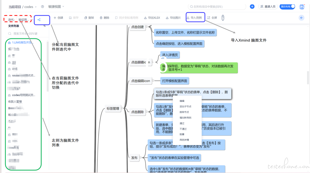 如果只用脑图用例,直接把脑图文件分到一个或多个迭代下,然后直接在脑图中执行用例,只是在执行前先切换到在哪个迭代下执行即可,从用例管理中心脑图维护中进入。可以导入 Xmind ,也可直接在 web 编写脑图。