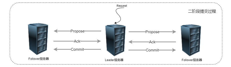 ZAB协议的消息广播类似于二阶段提交过程。顾名思义事务最终的提交要分为两个阶段。