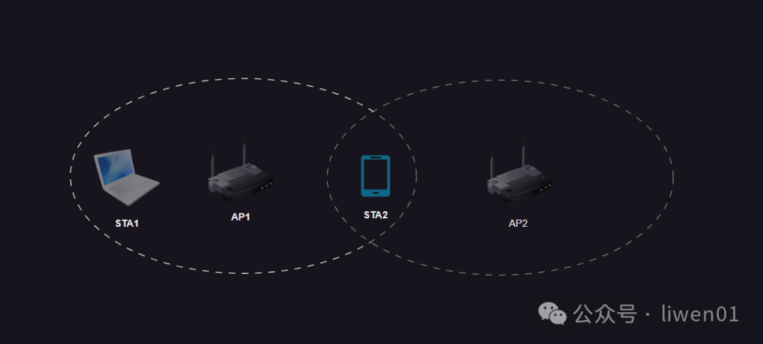 手机位于两个路由器中间,并且距离两个路由器都比较远,这个时候路由器 AP1 检测不到路由器 AP2 的信号,两个路由器之间都不知道对方是否有在给手机 STA2 发送数据。