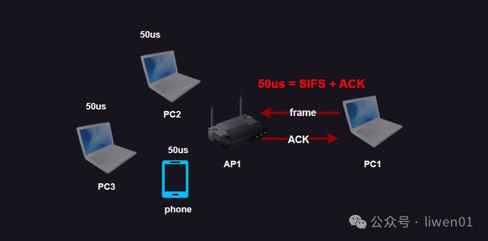 PC2、PC3、phone 在收到 frame 数据帧后,会去读取该帧的 Duration 字段,然后重置自己的 NAV 计数器为 Duration 字段的值 50 us。