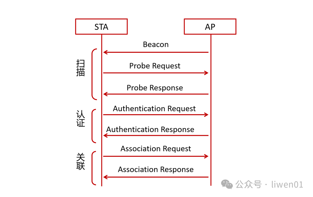 我们手机、笔记本电脑等设备的 WiFi 模块一般工作在 STA 模式,路由器的 WiFi 一般工作在 AP 模式。当我们 STA 设备连接到路由器 AP 的时候,有三个过程:扫描、认证、关联。