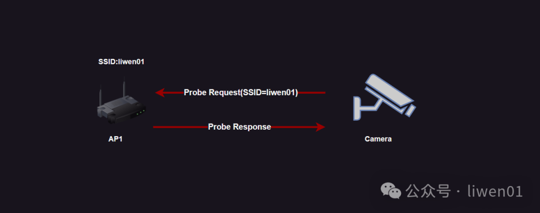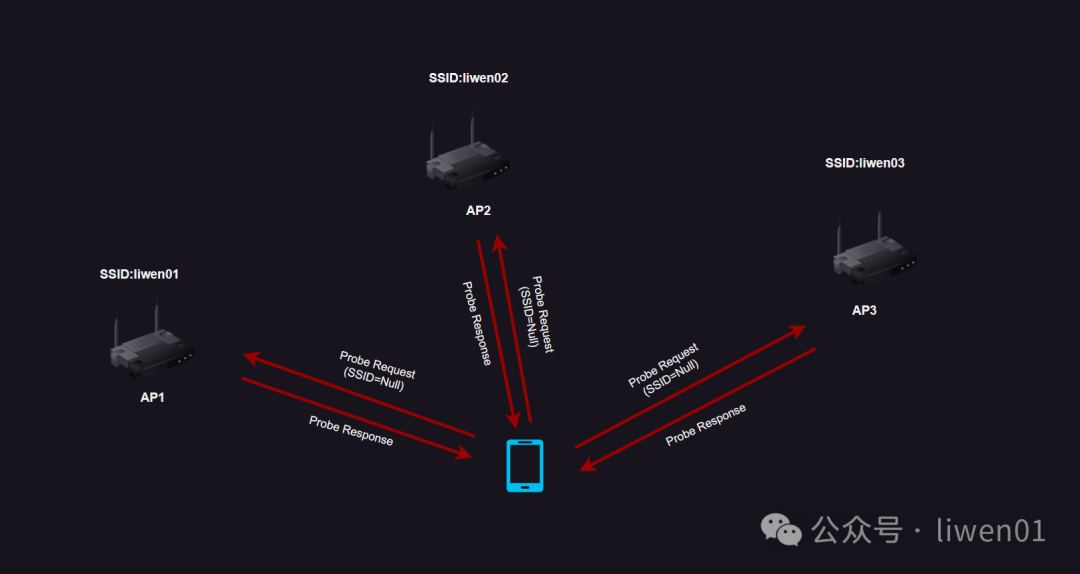 当探测请求是针对所有网络的广播时,探测包中 SSID 信息是为 NULL,接收到该探测包的 AP 都会返回探测响应包。