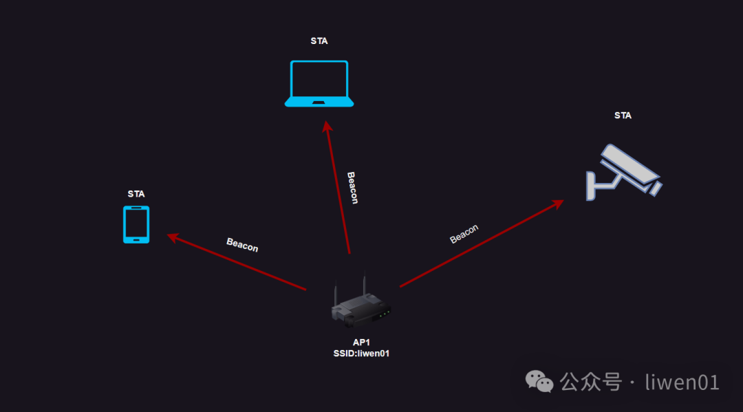在被动扫描过程中,设备不会主动发送探测请求,而是通过监听特定信道上的信标帧 (Beacon Frame),从中获取 AP 的信息。信标帧是 AP 定期广播的一种特殊的管理帧,所有设备只需监听信道即可获知周围可用的网络。