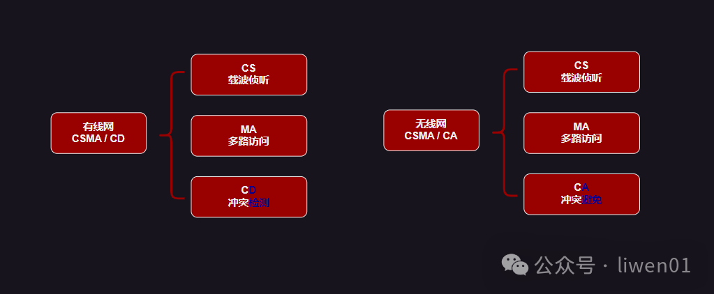 - CSMA/CA 用于无线网络,强调冲突的预防,以应对无线信道共享的挑战。