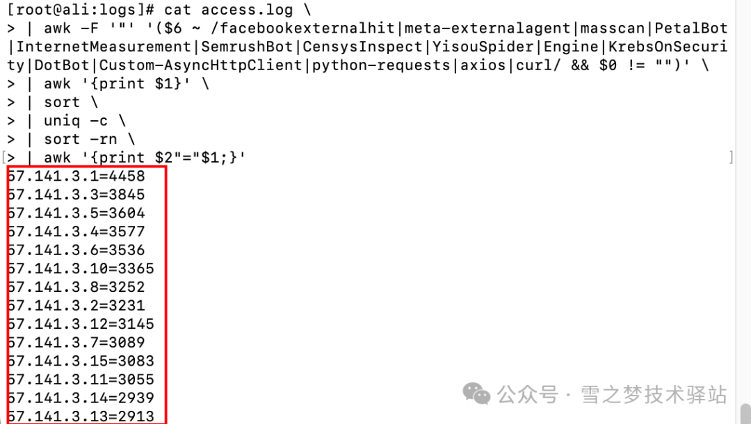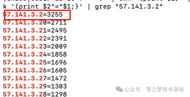 上述脚本统计出爬虫黑名单的全部 ip 出现的次数,还可以验证57.141.3.2