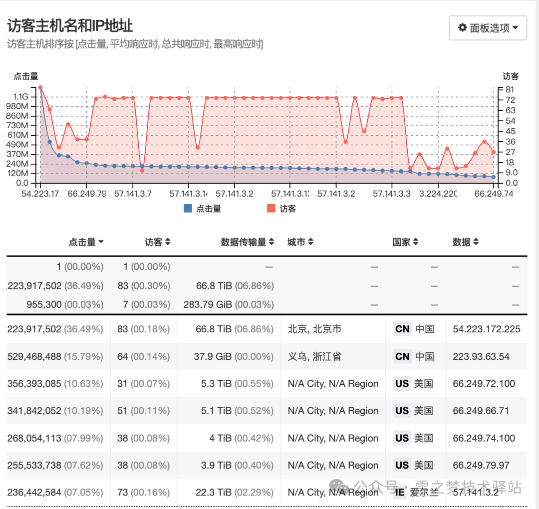 访客 ip 按照点击量排序,定位到美国和爱尔兰爬虫 ip,主要是谷歌爬虫.