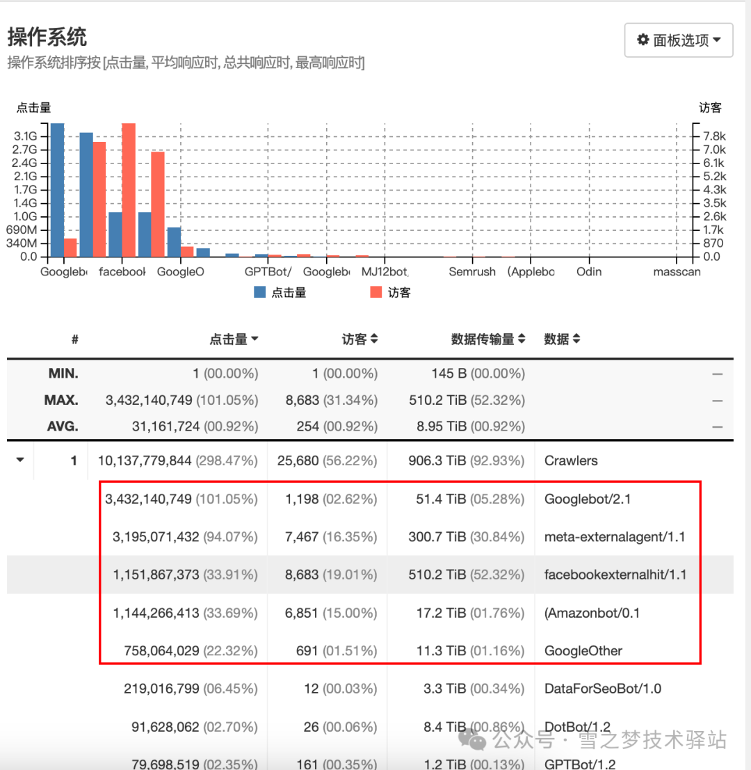 操作系统按照点击量排序,定位到谷歌/Facebook/亚马逊爬虫最为突出.