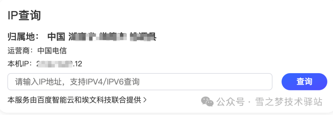当然,解锁 ip 也是很简单,因为拉黑的是外网 ip,所以直接百度 ip 就能看到自己的 ip,公众号[雪之梦技术驿站]私信回复 ip 就可以自动解锁,防止误伤.
