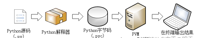 首先将Python源代码(.py文件)编译生成Python字节码(Python Byte Code,字节码文件的扩展名一般是.pyc),然后再由Python虚拟机(Python Virtual Machine,简称PVM)来执行Python字节码,最后在终端输出运行结果。