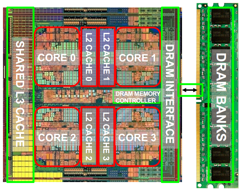 - 两个 core,每个都有一个私有的12 MB的L3缓存和一个1 MB的L2缓存,图中深蓝色部分均为L3缓存。