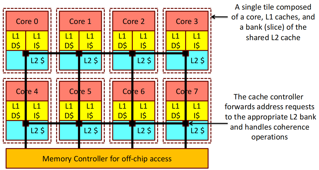 这张图片展示了一个多核处理器的结构,其中每个 Core 都有自己的L1缓存 (L1 D 和 L1 I)以及共享的L2缓存切片 。并且每个 Core 的L1缓存和L2缓存切片组合在一起,构成了一个独立的单元(Tile)。