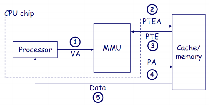 - **处理器发送虚拟地址(VA)到MMU:**处理器生成一个虚拟地址(VA)并将其发送给MMU,以请求访问存储在内存中的数据。
