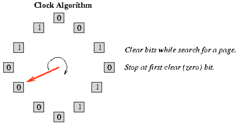 - 指针(Hand):CLOCK算法使用一个"指针"或"手"(hand),指向最近被检查的帧。当需要进行页面置换时,指针会顺时针扫描列表,寻找合适的页面来置换。