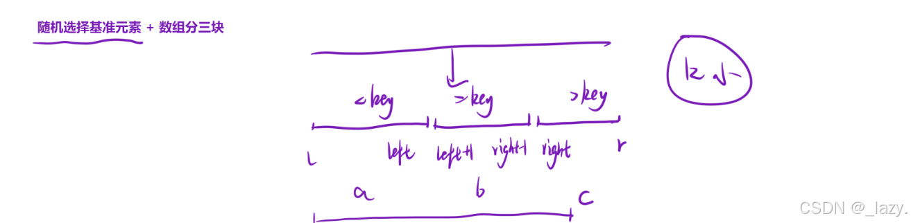 在前文我们知道,我们利用三个指针,将数组划分成了三个区域,分别是小于K的,等于K的,大于K的,那么我们要在该区域里面查找到第K个最大的元素,其实当我们划分好了区域之后,我们不妨分情况讨论,对于第三个区域,命中第K个数的可能性是最大的。