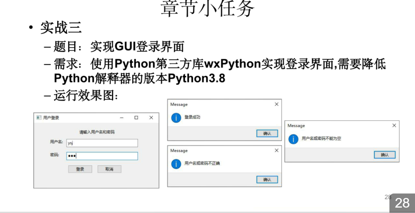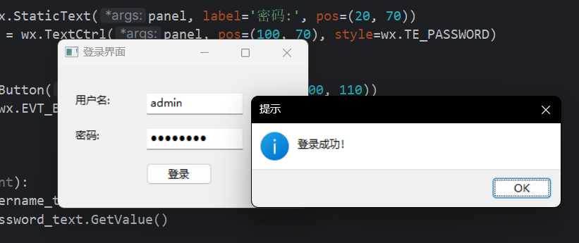 on_login方法中获取用户输入,进行简单的用户名和密码验证,并通过wx.MessageBox显示结果。