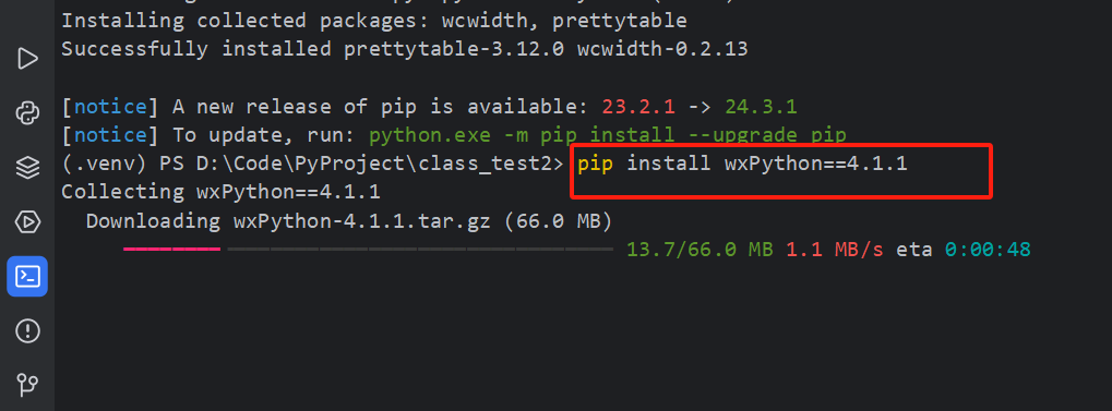 如果你还没有安装 wxPython,可以使用以下命令进行安装: