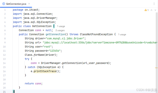由于每次操作数据库时,都需要加载数据库驱动、建立数据库连接以及关闭数据库连接,为了避免代码的重复书写,下面建立一个专门用于操作数据库的工具类。在src目录的cn.itcast包下创建一个GetConnection工具类: