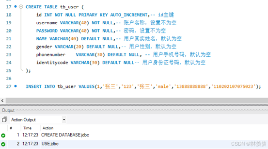 创建一个数据库表,使用下面sql语句在MySQLworkbench插入数据。创建的名称为jdbc的数据库,然后在该数据库中创建一个tb_user表,并在tb_user表插入一条用户数据: