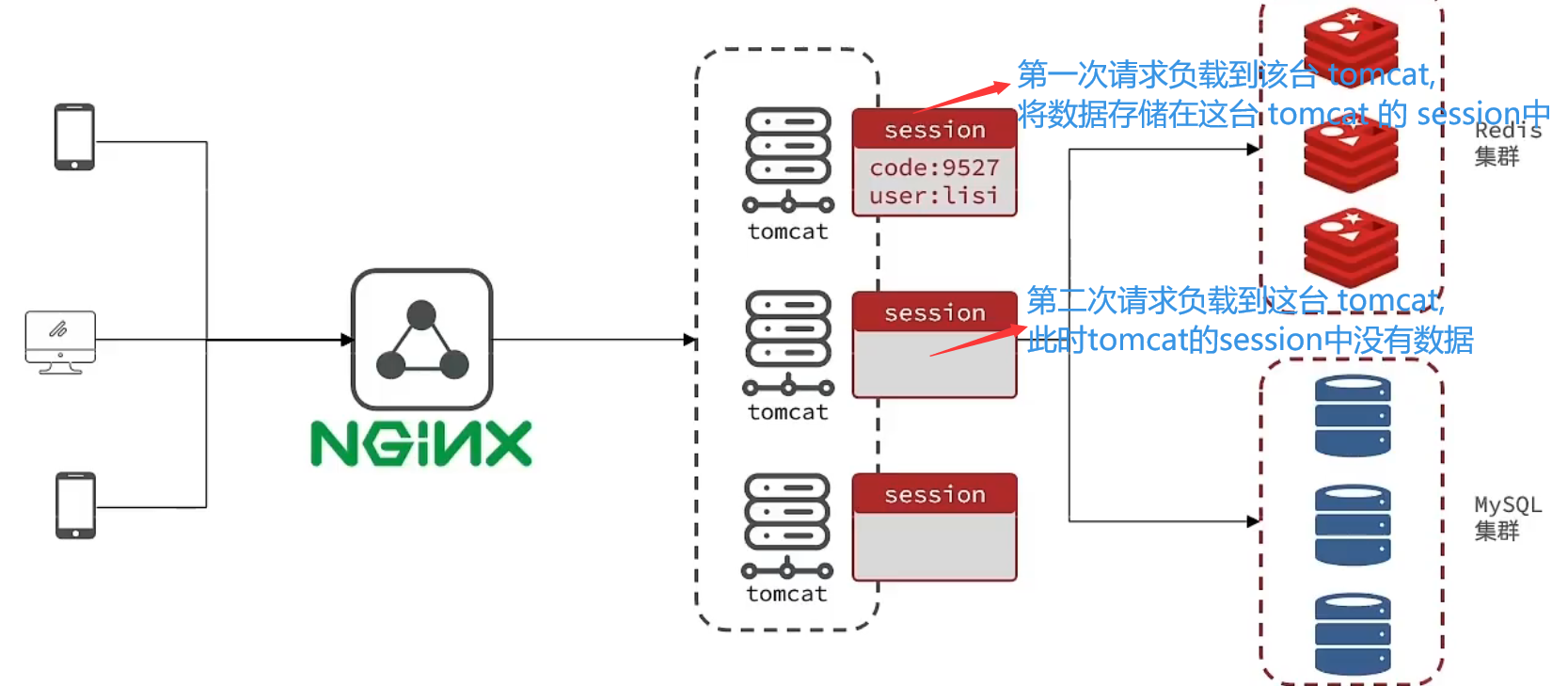 当第一次请求负载到第一台 tomcat 时,会将数据存储在该 tomcat 的 session 中,比如说验证码。