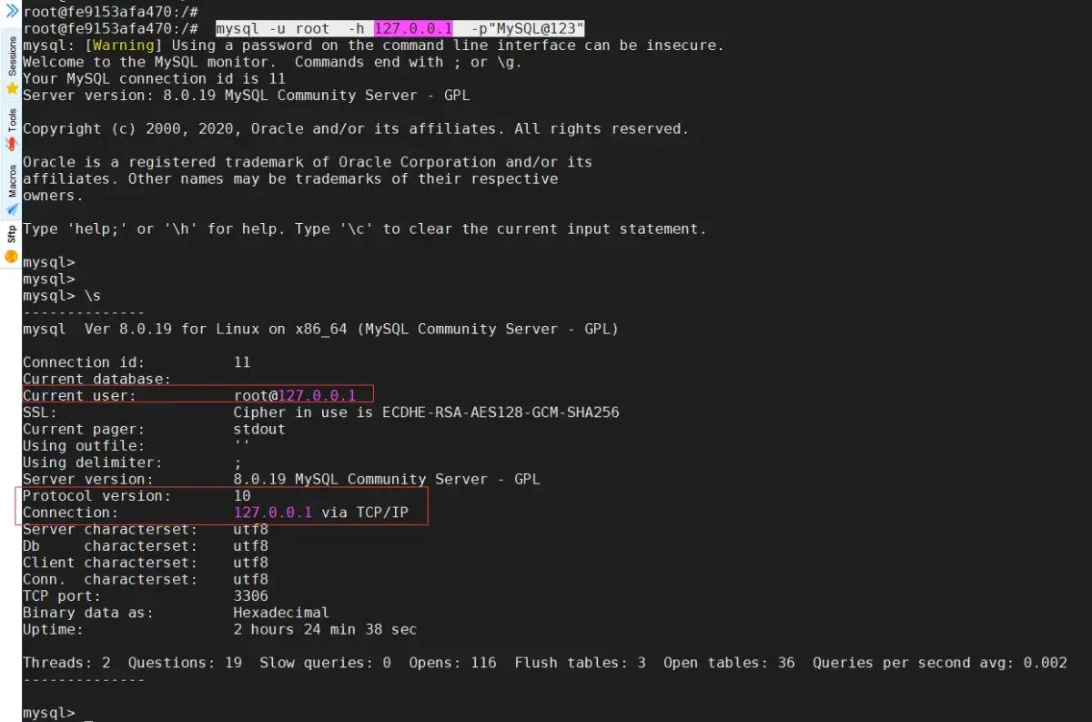 $ mysql -h 127.0.0.1 -u root -P3306 -p'XXX'