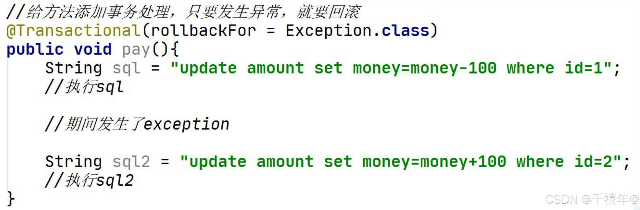 在方法上增加@Transactional注解,可以让spring帮我们处理事务的问题