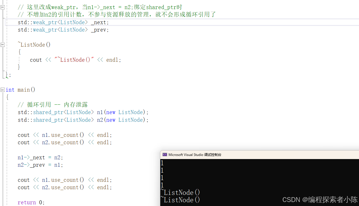 把ListNode结构体中的_next和_prev改成weak_ptr,weak_ptr绑定到shared_ptr时不会增加它的 引⽤计数,_next和_prev不参与资源释放管理逻辑,就成功打破了循环引⽤,解决了这⾥的问题