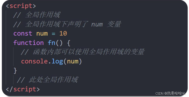 <script> 标签 和 .js 文件 的【最外层】就是所谓的全局作用域,在此声明的变量在函数内部也可以被访问。