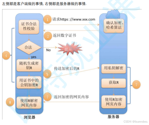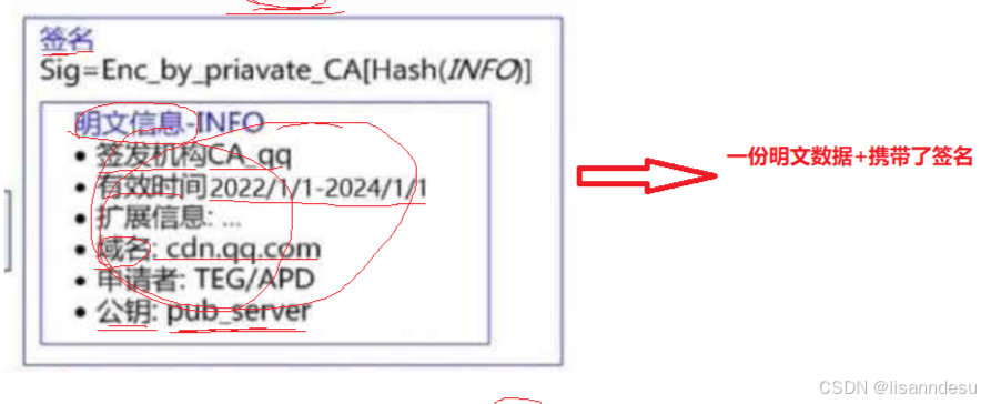 client第一次请求,得到的结果,不仅有公钥。实际上,得到的是证书。证书包含密钥,是++明文信息++ 。证书使用签名来保证证书完整性与不被修改。