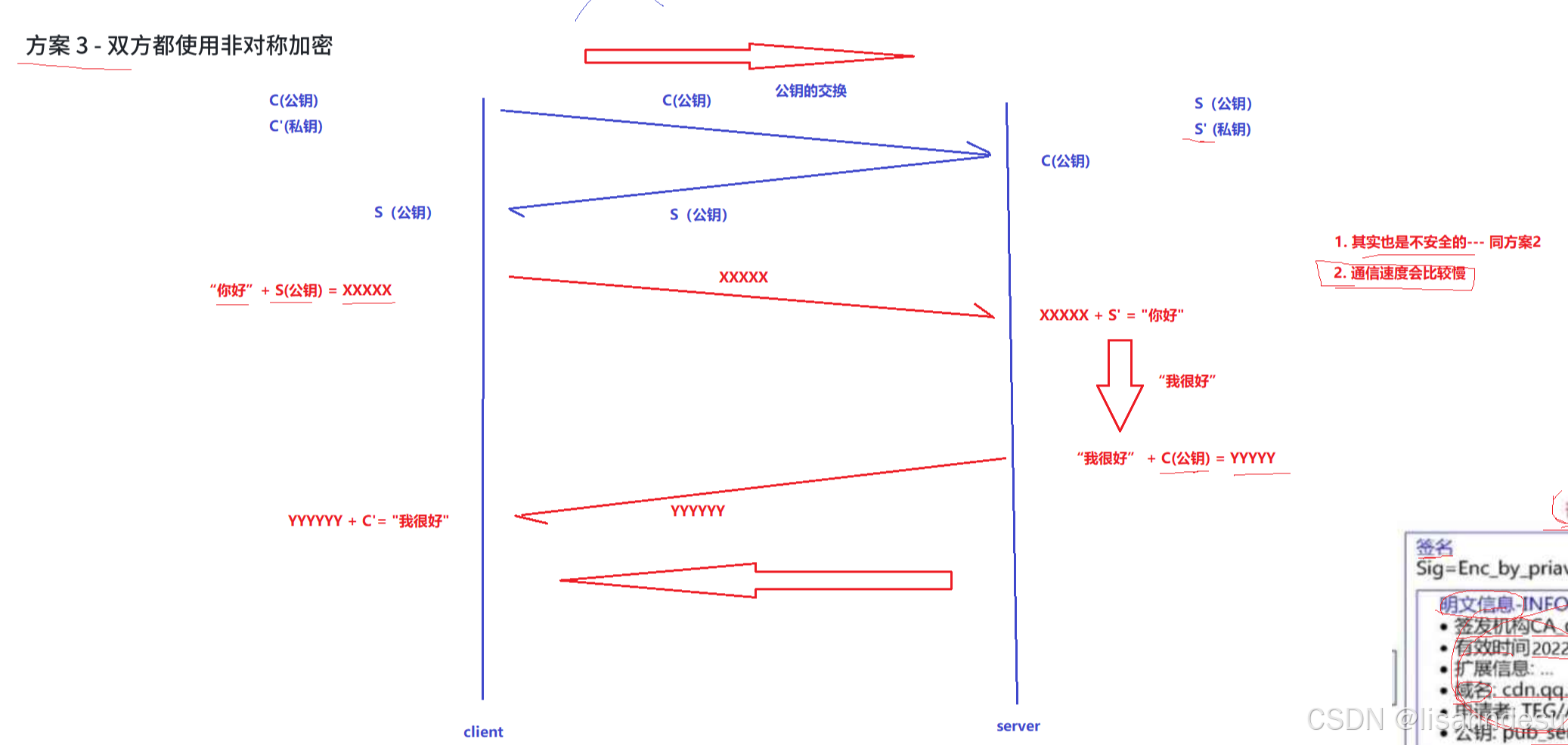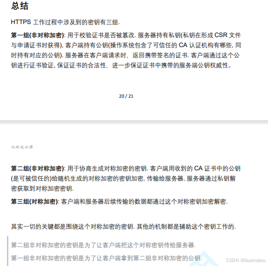 证书图片\]:  #### 签名+非对称加密+对称加密 配合关系 总的来说,签名和非对称加密就是为了保证client的**对称密钥安全地传输给server** ##### 签名保证证书完整性 保证server公钥不被中间人掉包 中间人无法在不被发现情况下对证书进行篡改,因为没有CA私钥 ##### 非对称加密保证只有server收到client对称密钥 只有服务器拥有server私钥,所以只有服务器可以解密/真正收到client的密钥,防止中间人获取client密钥 ##### 使用client对称密钥通信 此时可保证只有client,server拥有client对称密钥,之后client与server即可使用对称密钥安全且快速通信 #### 签名为什么先hash再形成摘要,而不是直接对签名形成摘要? 缩小签名密文长度,加快数字签名的运算速度 ### HTTPS整体流程   ### 板书笔记