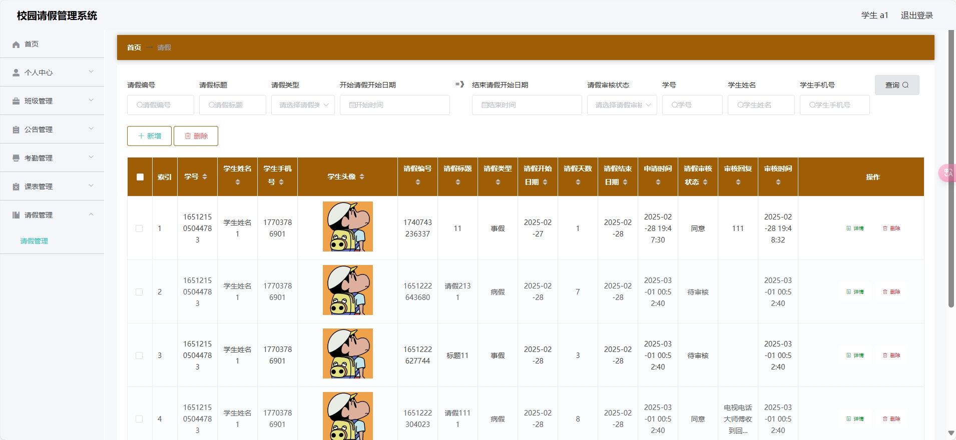 管理员可以查看所有学生的请假申请,并进行审批操作。